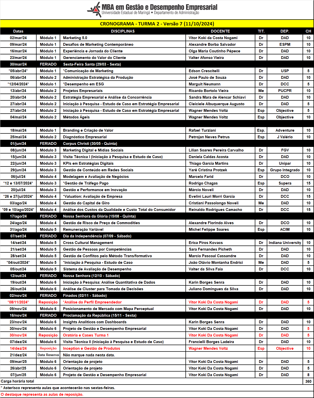 CALENDÁRIO MBA - TURMA 2 - Atualizado em 11/10/2024.