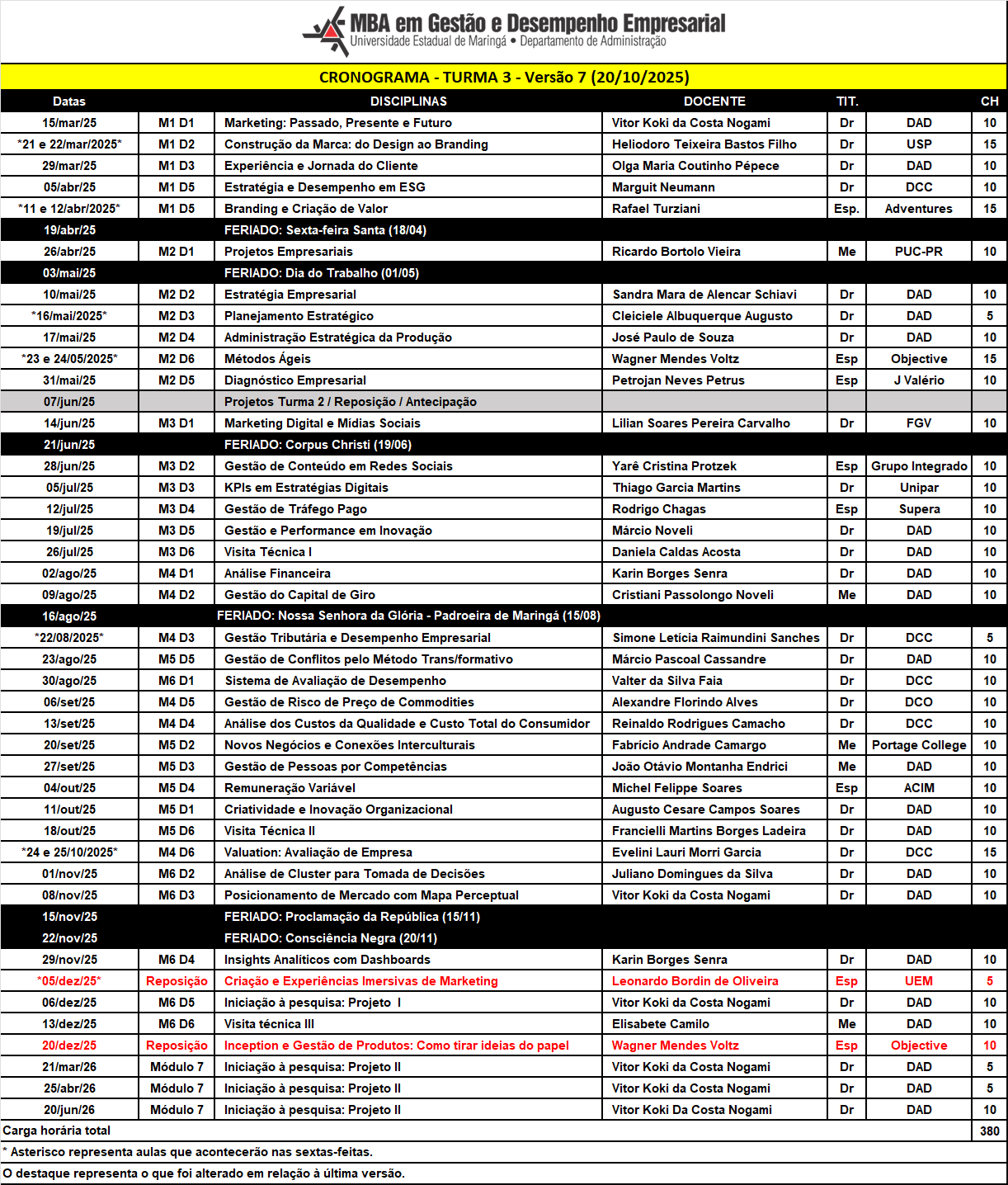 CALENDÁRIO MBA - TURMA 3 - Atualizado em 20/10/2025.